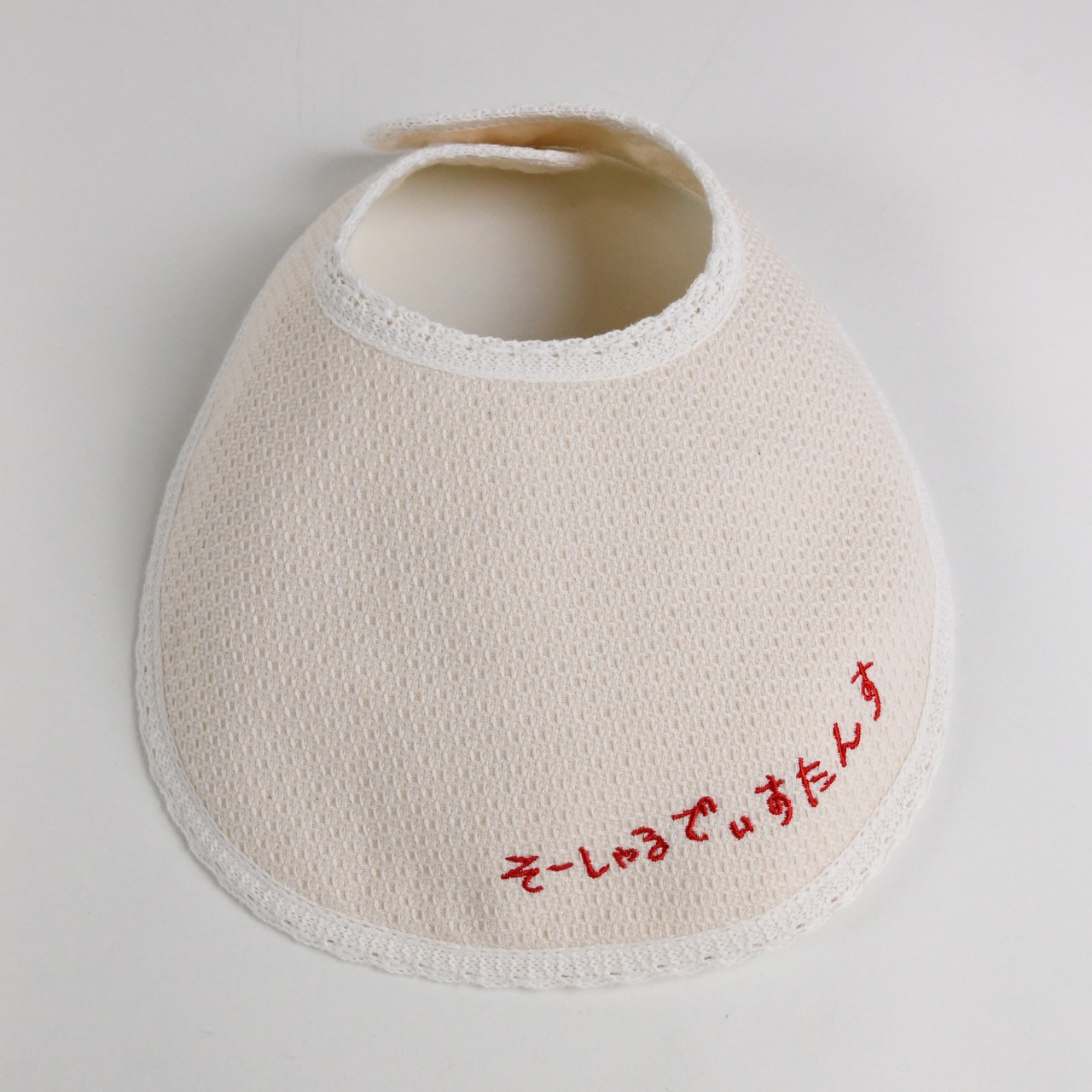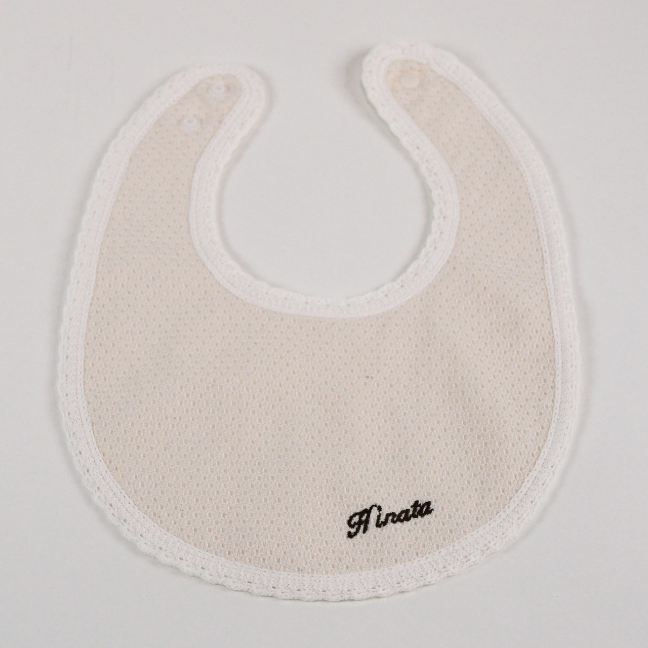 このスタイの素材は、漂白の工程を経ていない分、天然の油分を多めに含んでおります。使用前には軽く洗剤を入れて水通ししてください。その際には、製造工程で生地の端を焼いているため、茶色い水が出ますが、人体に無害です。しっかりとすすいでご使用ください。以後は通常の綿製品と同じ扱いをしてください。酸素系漂白剤での短時間のお洗濯は可能ですが、塩素系漂白剤は、使用しないでください。刺繍糸の色が落ちてしまいます。